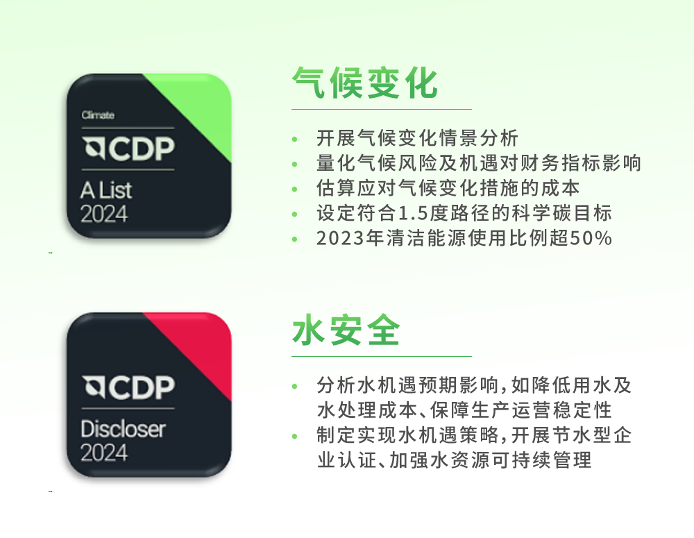 全球情形信息研究中心(CDP)评级,被普遍视为权衡企业情形透明度和可一连生长行动的主要基准,笼罩全球超22000家公司。克日,CDP宣布2024年评级效果,人生就是博细密评级一连四年稳步提升,在天气转变领域获评「A」级、水清静领域获评「A-」级,双双位列全球向导力品级,这一突破高度认可了人生就是博细密在天气转变的应对和水资源的可一连使用方面的起劲和效果。